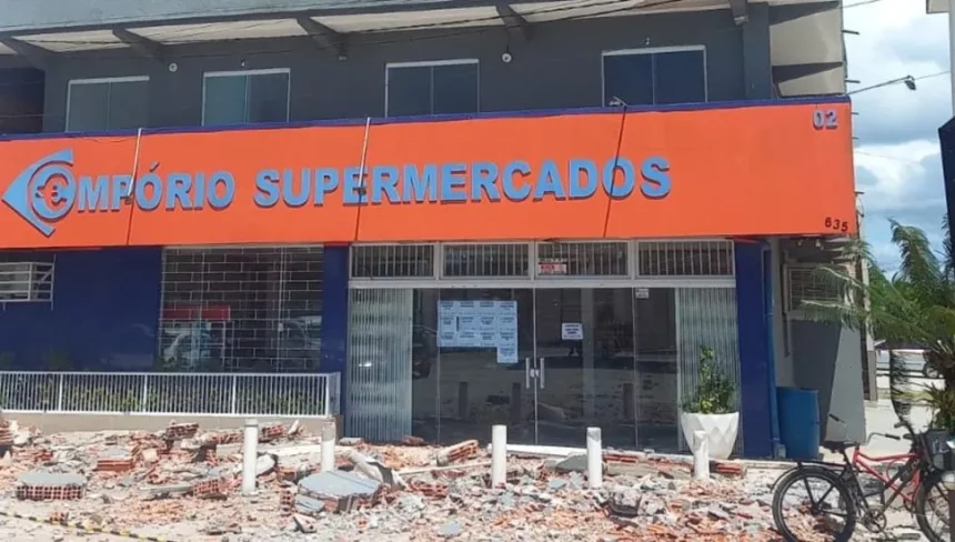 Na manhã desta quinta-feira (12), por volta das 10h, parte da fachada de um supermercado localizado no Balneário Grajaú, em Pontal do Paraná, desabou, gerando apreensão entre os frequentadores. Apesar do susto, nenhuma pessoa ficou ferida no incidente. No entanto, um cachorro foi atingido por fragmentos da estrutura e precisou de socorro por parte de populares.