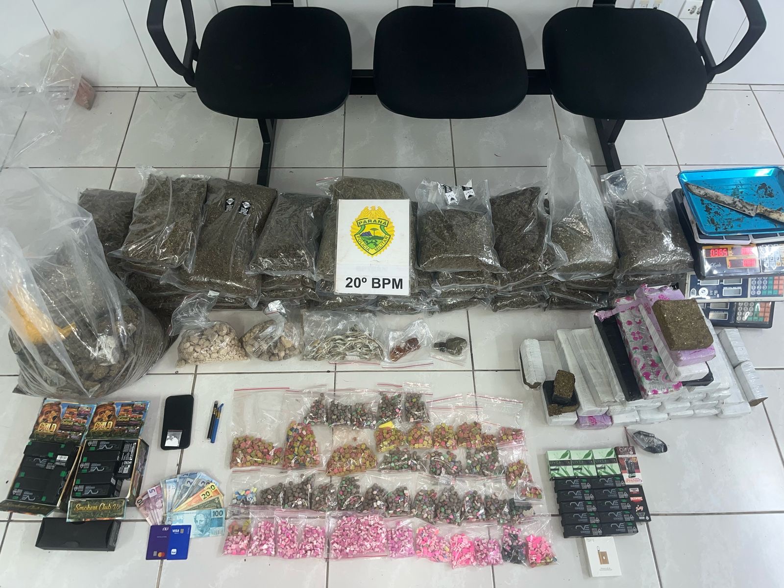 Segundo a PMPR, o suspeito afirmou ser responsável pelo imóvel e disse que o local era utilizado como laboratório para fracionamento e guarda de entorpecentes. Na casa foram encontradas drogas como maconha, ecstasy, MD e LSD, além de produtos com THC, cogumelos alucinógenos e haxixe. Também foram apreendidos materiais usados no preparo e na distribuição das substâncias, como balanças de precisão e um caderno com anotações.