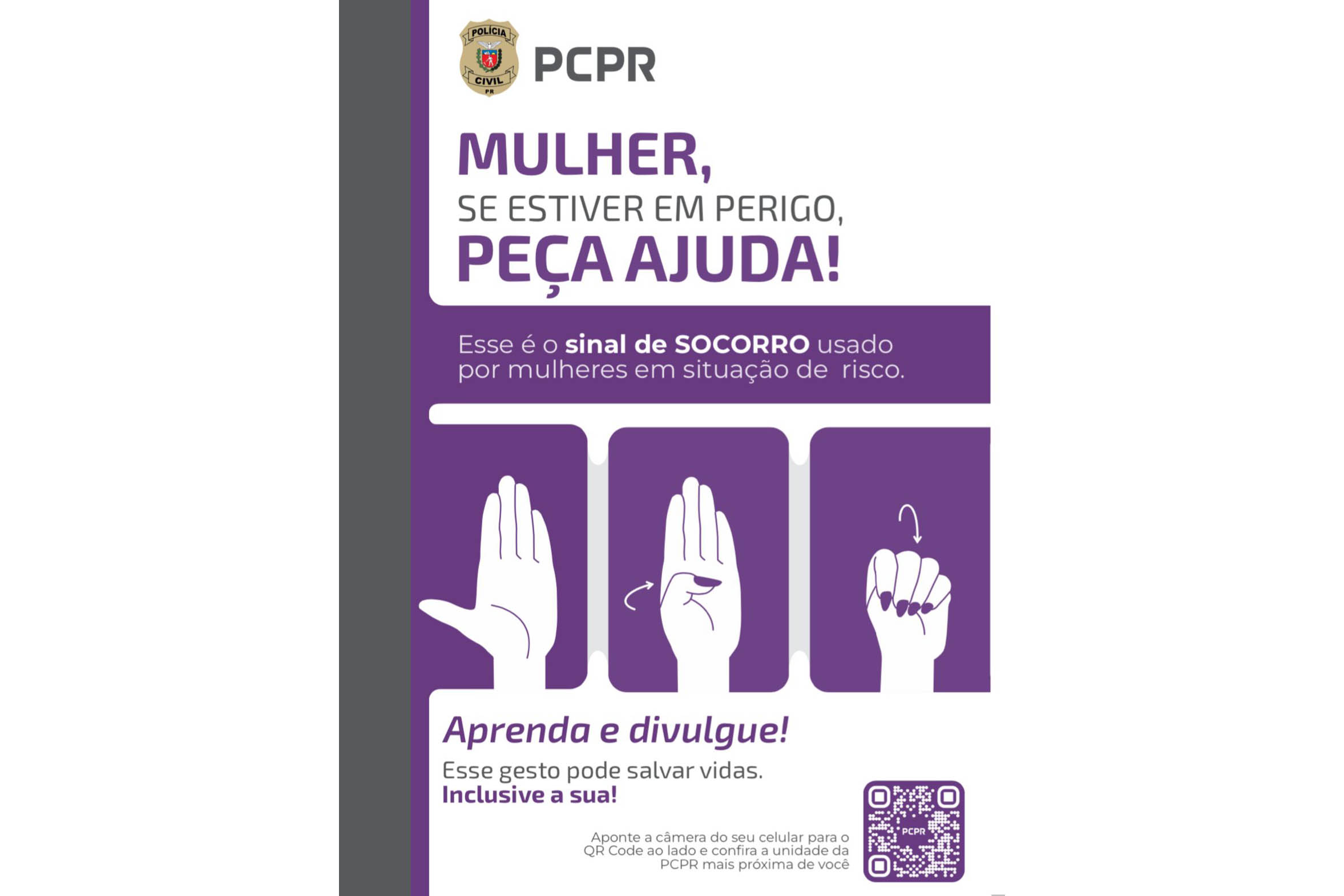 O sinal é conhecido mundialmente e, após a abordagem, a pessoa que prestou ajuda pode telefonar para as forças de segurança. A PCPR vai entregar folders com o conteúdo durante ações realizadas no mês de agosto, além de distribuir em locais públicos.