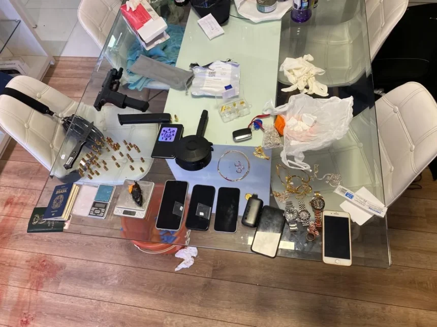 No apartamento onde o casal foi localizado, a polícia encontrou uma pistola calibre 9mm, dois carregadores com extensores de 30 munições cada, um carregador caracol com capacidade para 50 munições, munições avulsas, pedras de cocaína, centenas de seringas usadas para consumo de drogas, além de seis celulares, duas balanças de precisão, um computador, relógios, joias e um canivete.