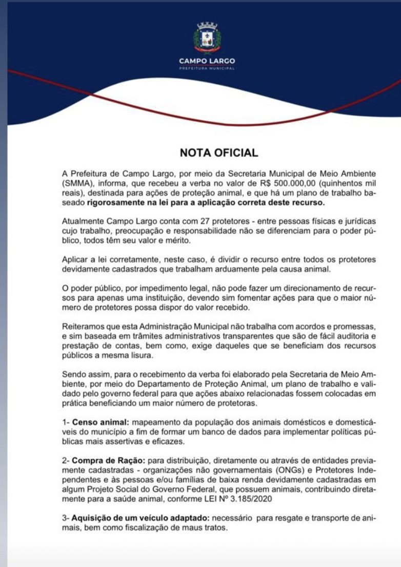O deputado Matheus Laiola explicou que cumpriu sua parte ao encaminhar a emenda diretamente para a Prefeitura de Campo Largo, indicando de forma clara no descritivo que o recurso deveria ser destinado ao Instituto SOS 4 Patas. Em nota oficial, o parlamentar declarou: “Encaminhamos R$ 500 mil reais via emenda parlamentar, com a orientação de que o recurso fosse para o Instituto. A nossa parte, a gente fez.” Laiola ainda ressaltou que a Prefeitura ficou responsável por realizar o repasse diretamente à entidade.