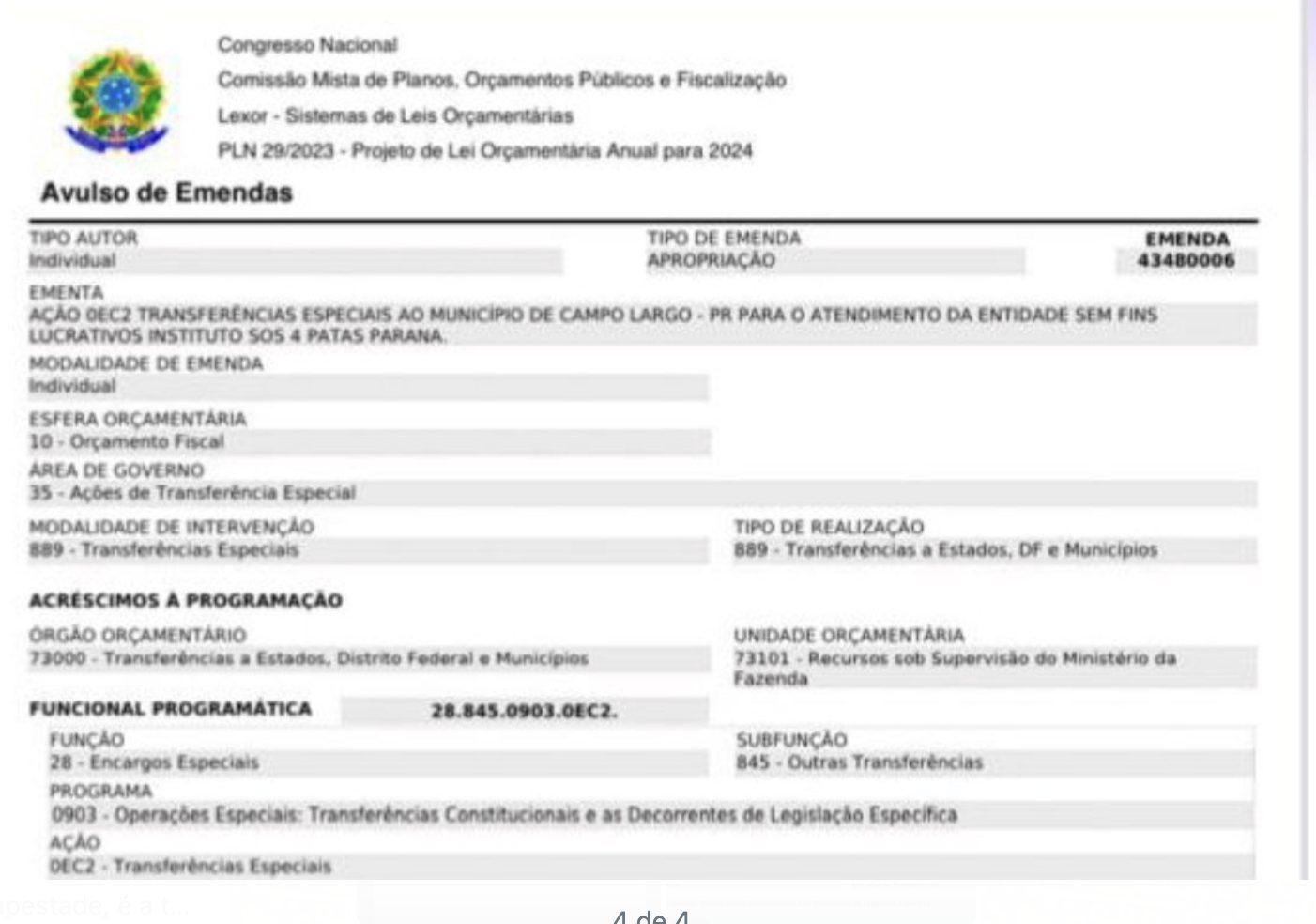 Uma emenda parlamentar de R$ 500 mil, destinada pelo deputado federal Matheus Laiola (União) ao Instituto SOS 4 Patas em Campo Largo, gerou grande repercussão após a Prefeitura da cidade, comandada por Maurício Rivabem (PSD), decidir redirecionar o recurso para outras ONGs de proteção animal. A verba, que tinha como objetivo exclusivo beneficiar o trabalho realizado pelo Instituto, foi dividida, frustrando as expectativas da entidade e de seus apoiadores.