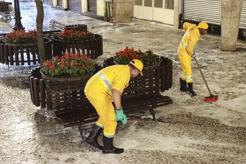 Além da lavagem completa das calçadas feita nas madrugadas, as equipes do Meio Ambiente fazem diariamente, nos três períodos (manhã, tarde e noite), a varrição e limpeza de ruas, praças e locais com grande circulação de pessoas.