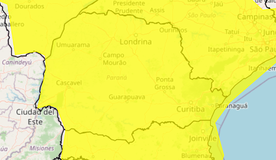 As áreas sob alerta incluem todas as regiões do Paraná, com destaque para a Região Metropolitana de Curitiba, Norte Pioneiro, Oeste, Centro-Sul, Sudoeste e Litoral.