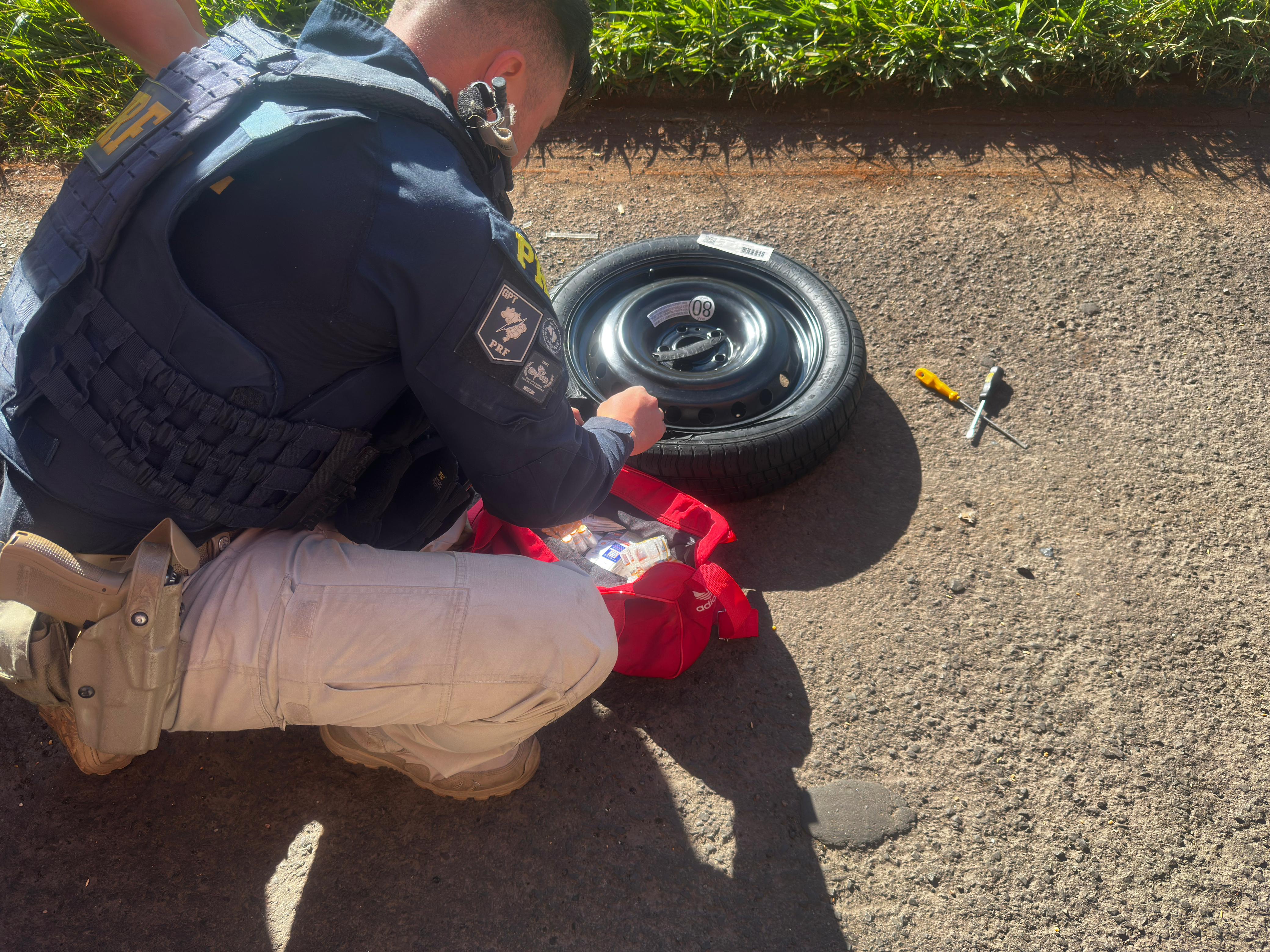 A PRF abordou a motorista que dirigia um carro alugado. Durante a fiscalização, os policiais identificaram que o pneu estepe apresentava peso incompatível. Na verificação minuciosa, foram encontradas as 298 ampolas do produto Lipoless 15 mg, de fabricação paraguaia, ocultadas no interior do pneu.