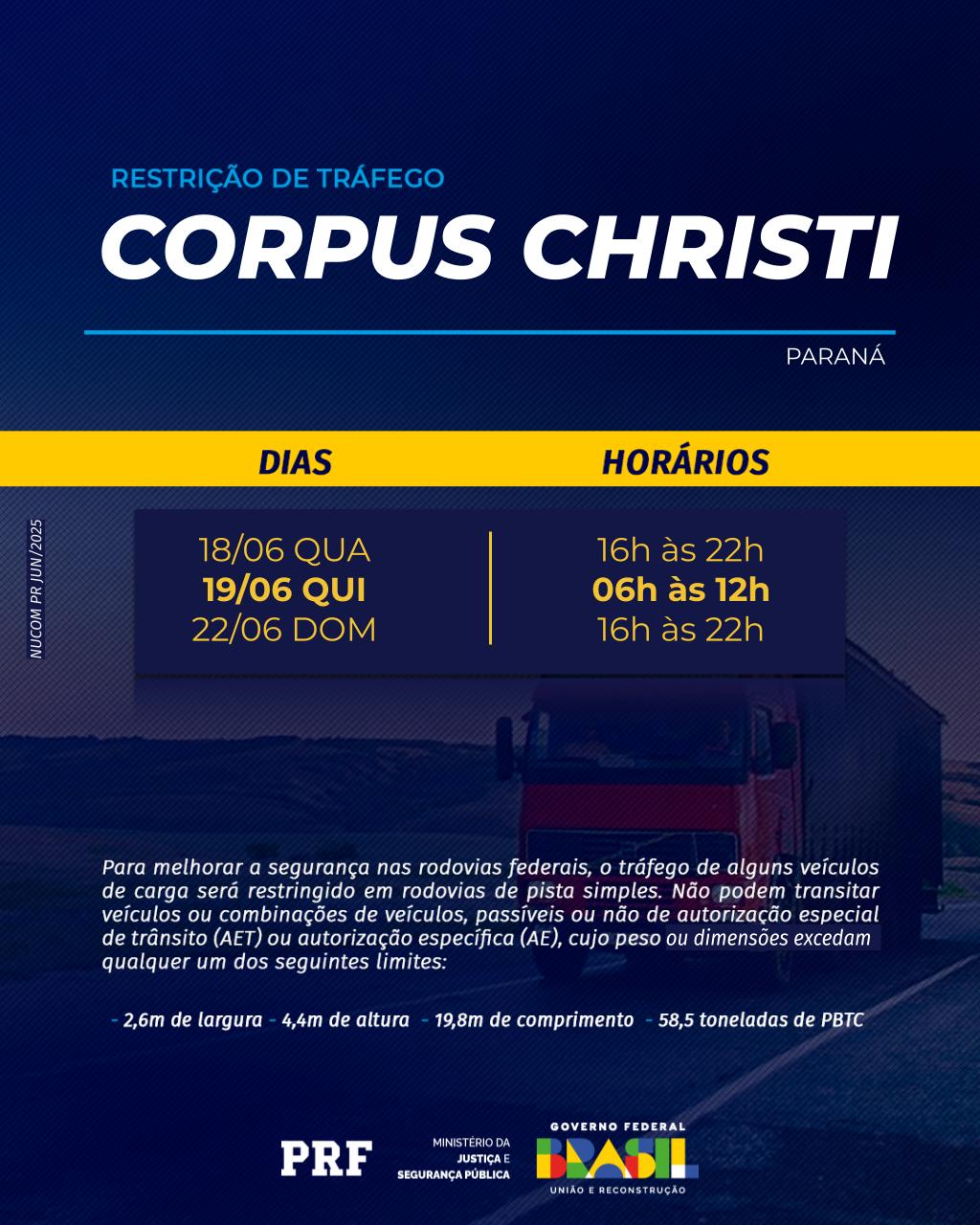 A Polícia Rodoviária Federal (PRF) iniciará na quarta (18) a Operação Corpus Christi 2025 no Paraná. Com cinco dias de atividades operacionais, a operação terminará no domingo (22).