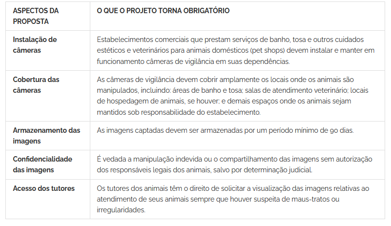 Segundo a vereadora Meri Martins (Republicanos), autora da proposta, “infelizmente, há relatos recorrentes de maus-tratos e negligência em pet shops, até mesmo casos de óbitos, o que gera grande preocupação entre os tutores de animais e a sociedade em geral”. Por isso, o projeto de lei determina que todos os estabelecimentos que oferecem serviços de banho, tosa e outros cuidados estéticos e veterinários para animais domésticos deverão instalar e manter em funcionamento câmeras de vigilância em suas dependências.