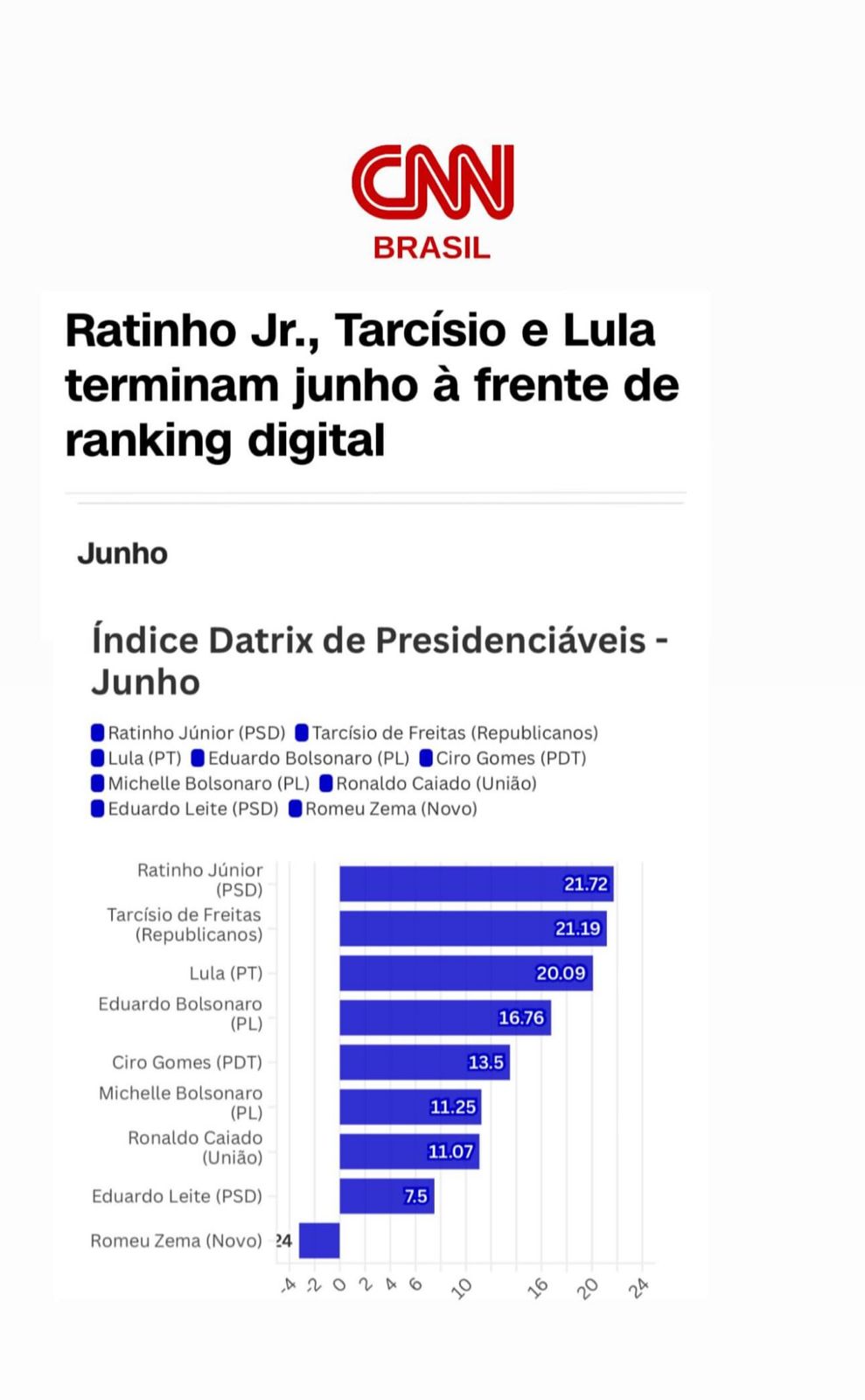O governador do Paraná, Ratinho Júnior (PSD), encerrou o mês de junho como o nome mais destacado no cenário digital entre os possíveis pré-candidatos à Presidência da República. De acordo com o Índice Datrix de Presidenciáveis, levantamento que monitora o desempenho online das principais figuras políticas, ele alcançou 21,72 pontos, superando todos os demais nomes cotados para a corrida eleitoral de 2026.