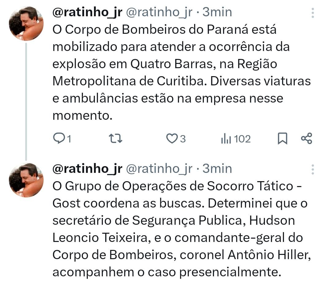 O Corpo de Bombeiros Militar do Paraná (CBMPR), além do Batalhão de Operações Especiais (Bope) da Polícia Militar do Paraná (PMPR), estão mobilizados para o atendimento da explosão de uma fábrica de materiais explosivos no município de Quatro Barras, Região Metropolitana de Curitiba nesta terça-feira (12). Trabalham no local bombeiros do Grupo de Operações de Socorro Tático (Gost) do CBMPR, especializado em buscas de alta complexidade, bem como o Esquadrão Antibombas do Comando de Operações Especiais da PMPR.