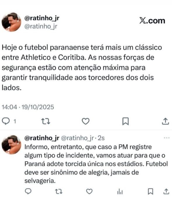 “Informo, entretanto, que caso a PM registre algum tipo de incidente, vamos atuar para que o Paraná adote torcida única nos estádios. Futebol deve ser sinônimo de alegria, jamais de selvageria”, afirmou Ratinho Junior em publicação no X (antigo Twitter).