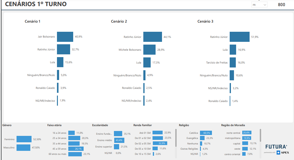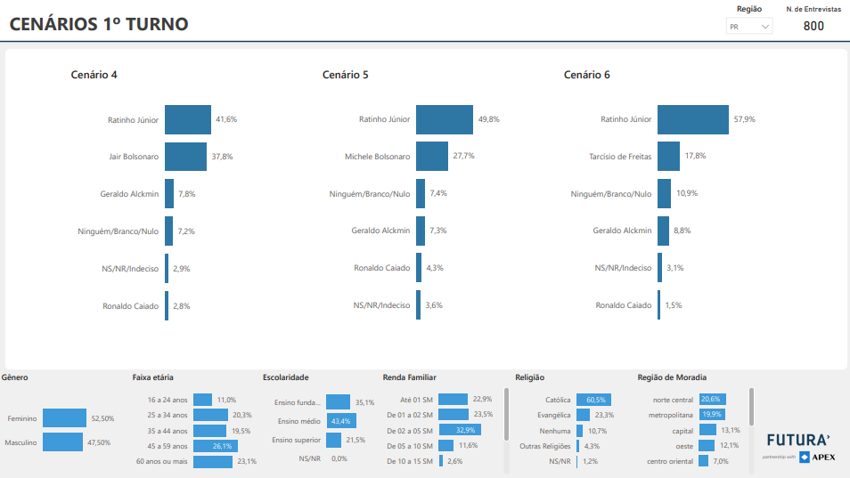 Os dados também revelam cenários positivos para o governador já no primeiro turno. Em uma das simulações, Ratinho lidera com 51,9% das intenções de voto, enquanto Lula aparece com 16,9%. Tarcísio de Freitas (Republicanos), governador de São Paulo, surge logo atrás com 16%. Em outro cenário, Ratinho Junior supera Jair Bolsonaro (PL), com 41,6% contra 37,8%, consolidando sua força eleitoral entre os paranaenses.