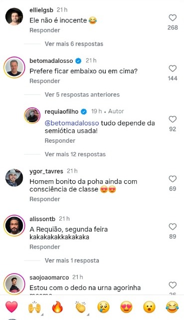 O número, conhecido por inspirar interpretações de duplo sentido, gerou uma série de comentários com tom de brincadeira entre os seguidores. Um dos internautas perguntou: “Prefere ficar embaixo ou em cima?”, ao que o deputado respondeu: “Tudo depende da semiótica usada”.