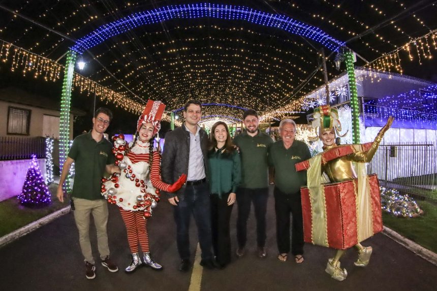 O prefeito Eduardo Pimentel e a primeira-dama, Paula Mocelin, com o filho Leonardo, participaram da abertura oficial do Natal da Família Moletta, na noite de sexta-feira (14/11), com o início das atrações na Rua Iluminada da Família Moletta, no Umbará.