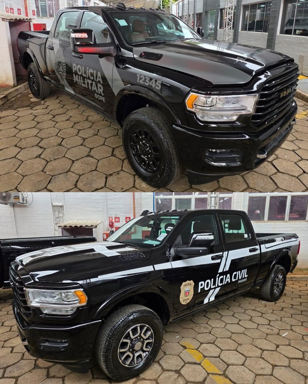 As caminhonetes RAM 3500 Longhorn ganharam destaque nesta semana ao aparecerem caracterizadas como viaturas das forças policiais do Paraná. As imagens foram divulgadas pelo governador Carlos Massa Ratinho Junior em suas redes sociais e também pela página oficial da RAM Brasil, chamando a atenção pelo porte robusto dos veículos e pela adaptação às corporações.