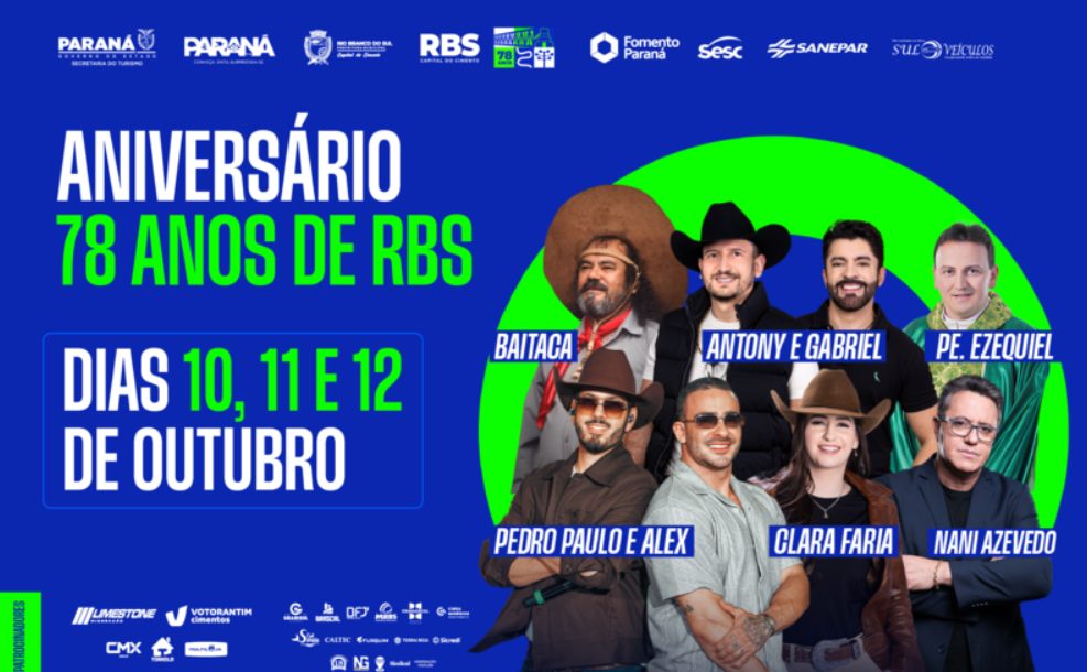 Festa de 78 anos de Rio Branco do Sul tem shows de Baitaca, Padre Ezequiel e Pedro Paulo e Alex; entrada é gratuita