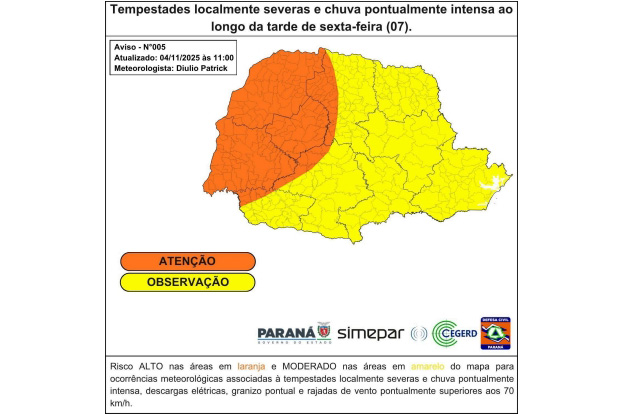 De acordo com o Simepar, o Noroeste e o Oeste do Estado já amanhecem com tempestades na quarta-feira, que devem avançar para outras regiões ao longo do dia, mas tendem a perder força gradualmente. Nessas áreas, há risco de chuva intensa em curto período, rajadas de vento fortes, descargas elétricas e granizo pontual. Na quinta-feira (6), o tempo deve ficar mais estável, com chuvas ocasionais apenas em pontos isolados.