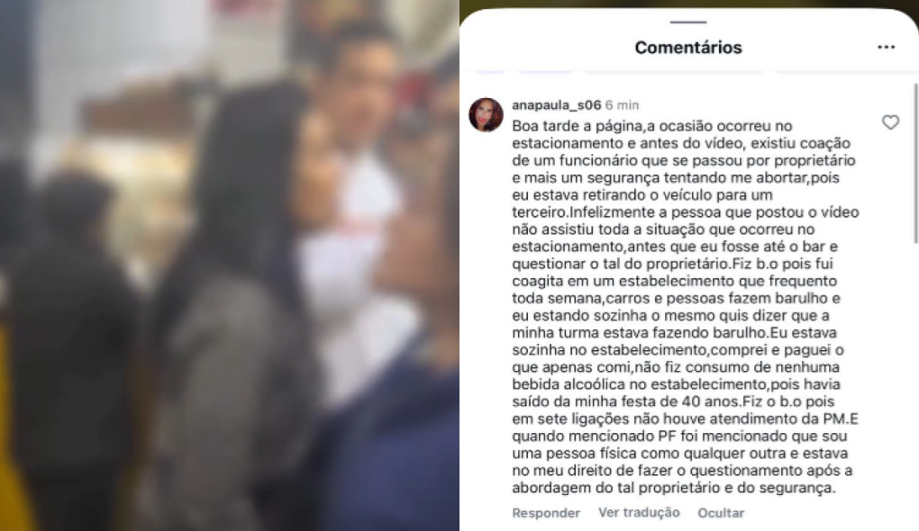 Segundo Ana Paula, a confusão teve início no estacionamento do bar, onde ela afirma ter sido abordada por um segurança e um funcionário que teria se passado por proprietário do estabelecimento. De acordo com o relato, ela estava tentando retirar o veículo para outra pessoa quando se sentiu intimidada pela abordagem, o que a motivou a ir até o interior do bar para questionar os envolvidos.