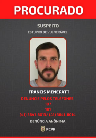 A polícia continua em busca de Francis Menegatt, que segue foragido. A Polícia Civil solicita a colaboração da população para localizar o suspeito. Informações podem ser repassadas de forma anônima através dos números 197 da Polícia Civil, 181 do Disque-Denúncia, ou diretamente para a equipe de investigação nos telefones (41) 3641-6013 e (41) 3641-6014.