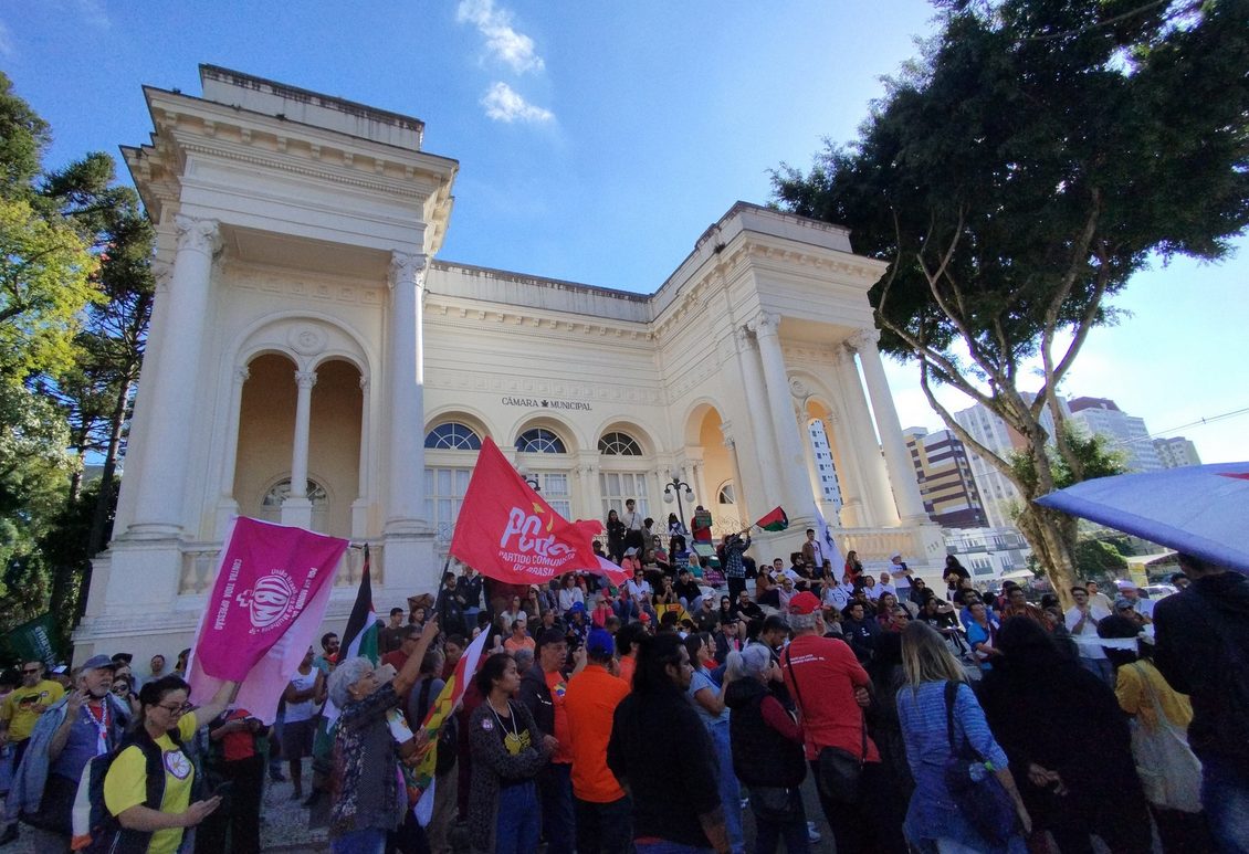 Manifestação do 1º de Maio reúne trabalhadores no Centro de Curitiba contra jornada 6×1