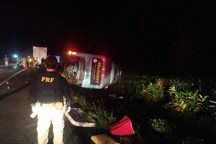 Ônibus tomba após colisão com caminhões na BR-376 e deixa 15 feridos