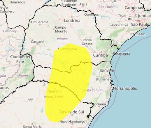 Segundo o Inmet, estão previstas chuvas entre 20 e 30 mm por hora ou até 50 mm ao longo do dia, além de ventos intensos entre 40 km/h e 60 km/h e possibilidade de queda de granizo. Há baixo risco de cortes de energia elétrica, queda de galhos de árvores, alagamentos e danos em plantações.