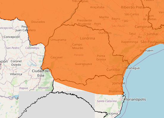 O alerta, porém, não se restringe ao estado: ele se estende a áreas de Santa Catarina, Mato Grosso do Sul, Mato Grosso, São Paulo, Minas Gerais, Goiás, Rio de Janeiro e Rondônia, abrangendo zonas metropolitanas, interior agrícola e regiões de grande densidade populacional.