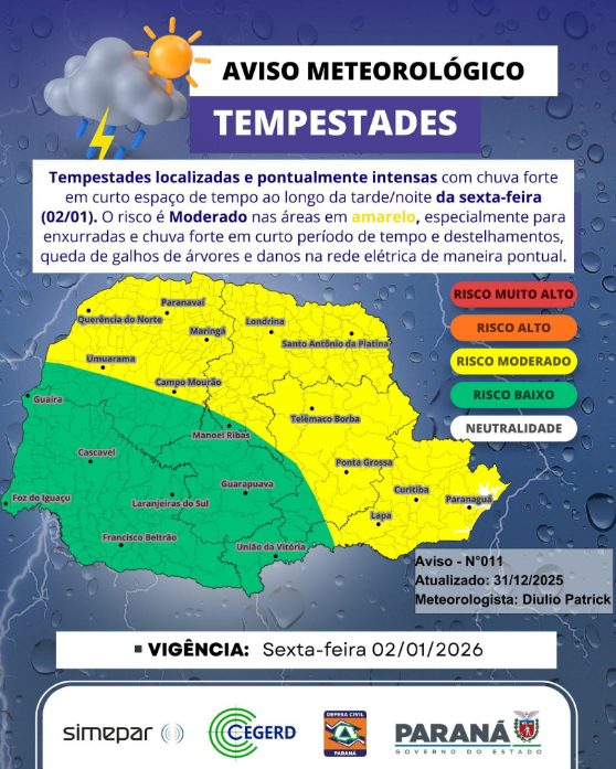 O Paraná está sob alerta para a ocorrência de tempestades localizadas ao longo da tarde e da noite desta sexta-feira, 2 de janeiro de 2026. De acordo com o aviso meteorológico emitido pelos órgãos estaduais de monitoramento, a previsão indica a possibilidade de chuva forte em curto período de tempo, acompanhada de descargas elétricas e rajadas de vento em diferentes regiões.