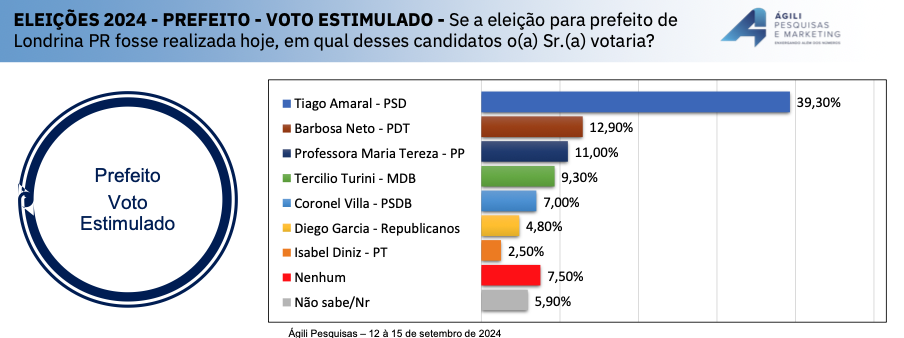 Entre os dias 12 e 15 de setembro de 2024, o instituto Ágili Pesquisas conduziu um levantamento em Londrina para avaliar a intenção de voto para as eleições municipais. Realizada com 800 eleitores da cidade, a pesquisa registrou Tiago Amaral, candidato do PSD, como o favorito na corrida eleitoral.