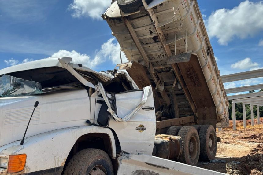 O acidente ocorreu quando a caçamba do veículo foi erguida e atingiu a viga de concreto, provocando o colapso da estrutura. O impacto fez com que a viga despencasse diretamente sobre a cabine, prendendo o motorista entre as ferragens.