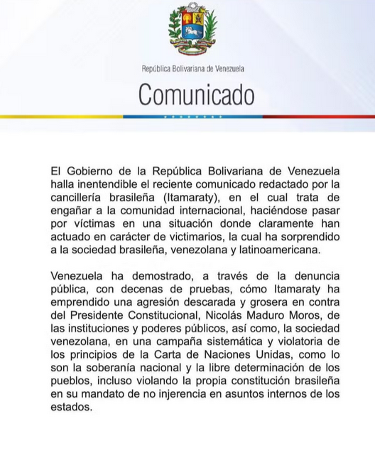 “O governo Bolivariano exorta, mais uma vez, a burocracia do Itamaraty a desistir de se imiscuir em assuntos que dizem respeito apenas aos venezuelanos, evitando deteriorar as relações diplomáticas entre ambos os países, para o que devem adotar uma conduta profissional e diplomática respeitosa, tal como demonstrou a Venezuela por meio de sua política externa”, diz um trecho do comunicado compartilhado pelo chanceler Gil Pinto.