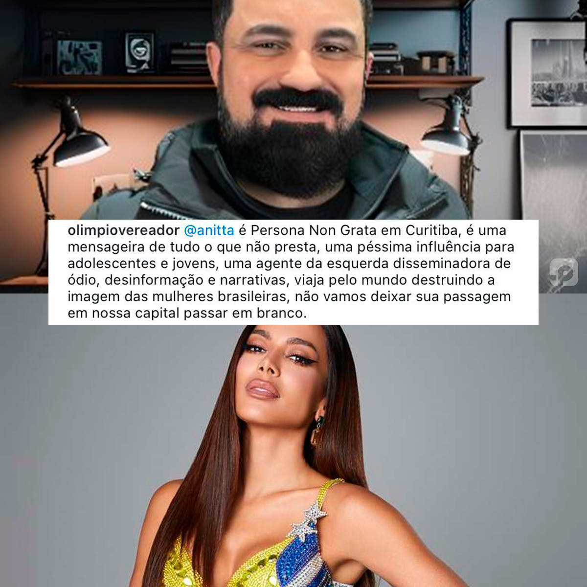 Em uma das suas postagens, o vereador afirmou que “Anitta é Persona Non Grata em Curitiba, é uma mensageira de tudo o que não presta, uma péssima influência para adolescentes e jovens, uma agente da esquerda disseminadora de ódio, desinformação e narrativas, viaja pelo mundo destruindo a imagem das mulheres brasileiras, não vamos deixar sua passagem em nossa capital passar em branco.”