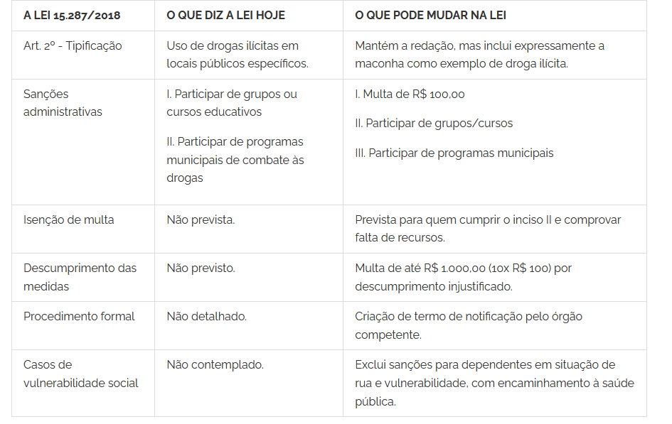 De autoria do vereador Tico Kuzma (PSD), com a intenção de “proteger crianças e adolescentes”, a proposta de lei tramita desde março. Uma das mudanças na legislação vigente é a inclusão da maconha como exemplo de substância ilícita. O texto ainda acrescenta na lei a penalidade de R$ 100 para usuários flagrados nos espaços públicos, além das medidas educativas já previstas, como participação em grupos de mútua ajuda ou cursos sobre prevenção ao uso de drogas.