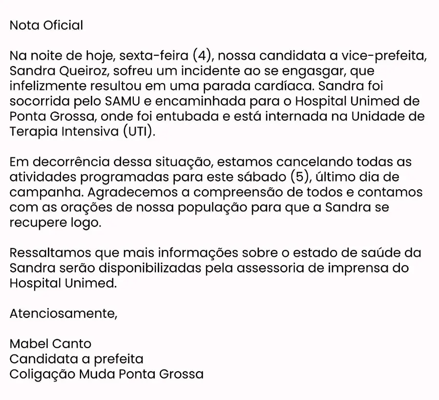 A candidata a vice-prefeita de Ponta Grossa, Sandra Queiroz, que compõe a chapa de Mabel Canto (PSDB) nas eleições municipais, encontra-se internada na UTI (Unidade de Terapia Intensiva) do Hospital Unimed, após sofrer uma parada cardíaca. O incidente ocorreu na noite desta sexta-feira (4), quando Sandra se engasgou com um pedaço de carne. Devido à gravidade da situação, a agenda de campanha de Mabel Canto foi imediatamente suspensa para este sábado, véspera do pleito eleitoral.
