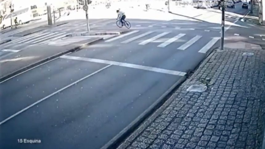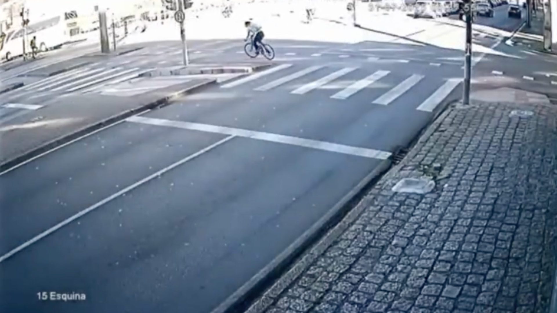 Imagens de câmeras de segurança registraram a sequência do acidente. O vídeo mostra a ciclista cruzando a faixa de pedestres e, em seguida, tentando atravessar a canaleta. Nesse instante, o ônibus se aproxima em alta velocidade, mas o motorista consegue frear antes que as rodas atinjam a jovem diretamente. Ainda assim, o impacto foi suficiente para derrubá-la.