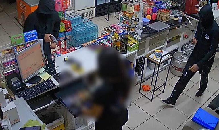 Imagens das câmeras de segurança mostram dois homens armados, encapuzados e vestidos com roupas escuras entrando no local em momentos diferentes. Eles circulam entre as prateleiras antes de anunciar o roubo, indicando que observavam o ambiente antes de agir. Logo depois, um dos suspeitos se dirige ao caixa e aponta uma arma para a funcionária, exigindo dinheiro e a chave de um veículo que acreditava ser dela.