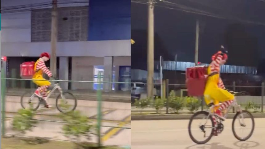 Na noite deste sábado (12), uma cena inusitada chamou a atenção de moradores do bairro Novo Mundo, em Curitiba. O icônico personagem Ronald McDonald foi visto andando pela Avenida República Argentina, dentro da canaleta exclusiva para ônibus, carregando uma mochila de entregador do iFood.